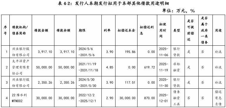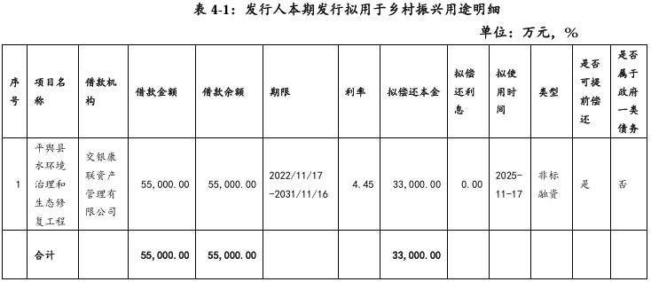 本期债券发行规模11亿元,期限3年,其中3.3亿元用于乡村振兴领域,具体为偿还发行人本部平舆县水环境治理和生态修复工程产生的借款本金;7.7亿元用于偿还发行人本部金融机构借款、应付债务融资工具等本息。
